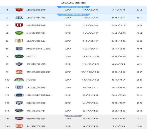 29轮过后的积分榜,争冠球队再次减员。成都蓉城因输给河南队跌至第3且落后上港4分,提前一轮无缘争冠。上港积63分继续领跑,申花则以61分升至第2。