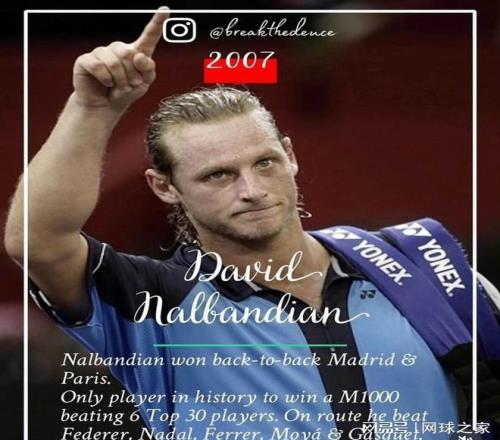 2007年的纳尔班迪安:这是大师赛历史上唯一一个一届赛事能击败6位世界前30的球员,一路上他击败了费德勒、纳达尔、费雷尔、莫亚、加斯奎特,含金量和当年他连克三巨头夺得马德里大师赛有得一比。