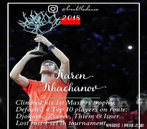 2018年的卡恰诺夫:俄罗斯雷神同样是三驾马车中最早一位夺得大师赛冠军的,他一共击败了四位世界前十(德约科维奇,兹维列夫,蒂姆,伊斯内尔)。他的状态有多咋舌?整个赛事仅仅丢掉一盘!