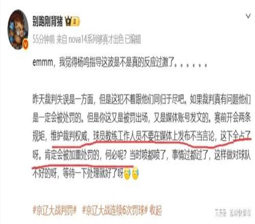 CBA常规赛第3轮,四冠王辽宁队在客场不敌北京队,遭遇到本赛季第一场败仗。不过,这一场比赛的最大争议点还在于,末节最后6分钟,杨鸣因不满裁判判罚,被直接连吹凉T,当场驱逐出场。而在赛后,杨鸣更是连夜更新社媒,疑似回击对裁判吹罚的不满。而从CBA过往的经验来看,辽宁队和杨鸣大概率会遭到篮协的重罚,毕竟,新赛季开始前,他们已经一再强调,教练员和球员不得在社媒上炮轰裁判以及吹罚。