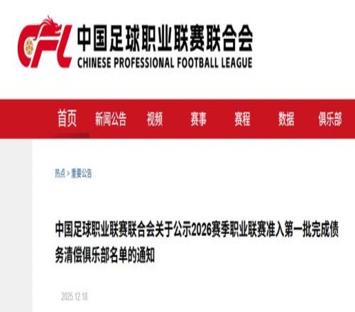 12月18日,中足联发布“关于公示2026赛季职业联赛准入第一批完成债务清偿俱乐部名单的通知”。拥有新赛季中超资格的16支球队中,北京国安、青岛西海岸、青岛海牛暂未在列。三级联赛共有10支球队暂未入列,除了上述3支中超球队,还有中甲梅州客家、南京城市;中乙广西平果、江西庐山、兰州陇原竞技、山西崇德荣海、赣州瑞狮。