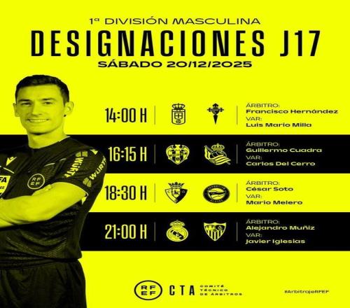 西班牙足协公布了联赛第17轮第2比赛日的裁判名单,穆尼斯执法皇马vs塞维利亚。
