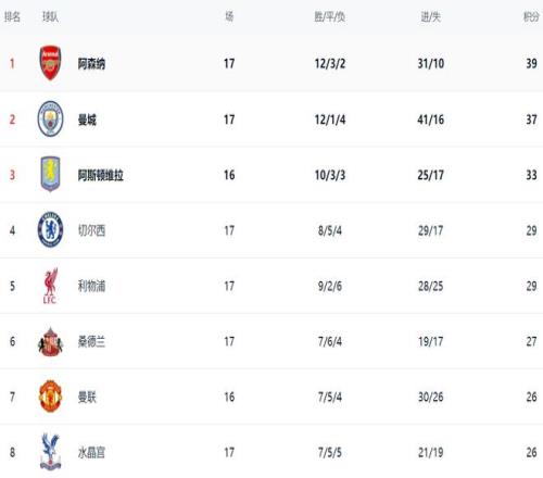 在积分榜上,阿森纳以39分排名榜首。曼城拿到37分,以2分的劣势排名第2。第3的是阿斯顿维拉,拿到33分。不过,阿斯顿维拉少赛一场。切尔西以29分排名第4。利物浦赢球之后,总积分也达到29分,升到了第5名,距离欧冠区只有一步之遥。桑德兰27分排名第6。曼联26分排名第7。水晶宫也是26分,排名第8。热刺只拿到22分,排名第13。