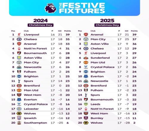 北京时间12月25日,德转列出了2024年和2025年圣诞节当天的英超积分榜,巧合的是,利物浦和阿森纳以相同的积分以及净胜球分别排名第一。与上赛季同期相比,阿森纳(+6分)、曼城(+10分)、阿斯顿维拉(+8分)以及曼联(+4分)成绩均有提升。